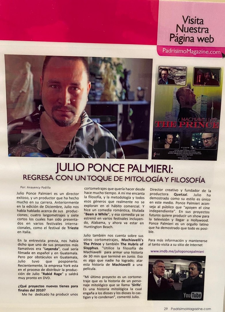 Padrisimo Magazine (US) December 3 2009, pg. 36-37, by: Victoria Garcia, "Julio Ponce Palmieri: Cine con sello latino"